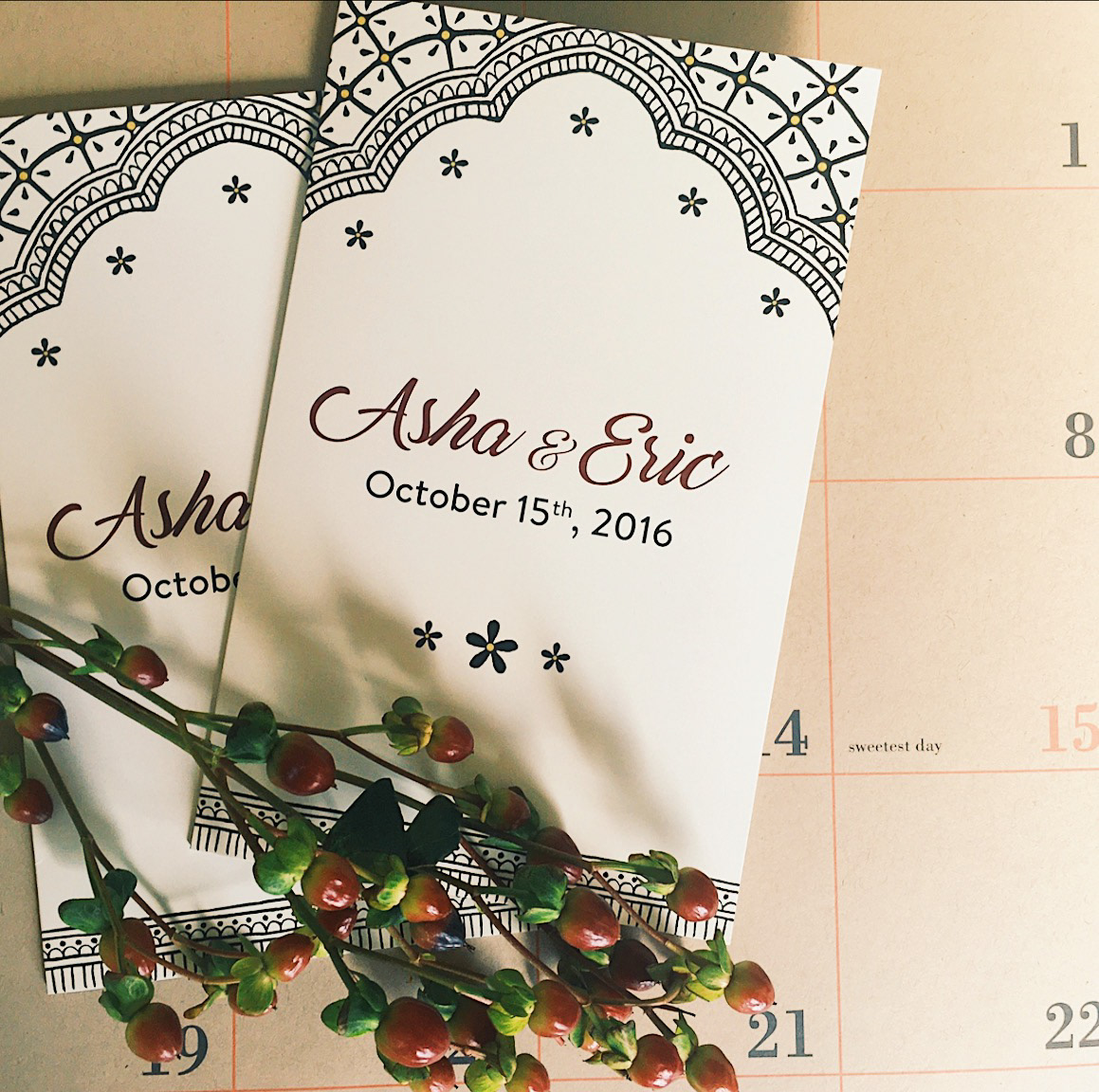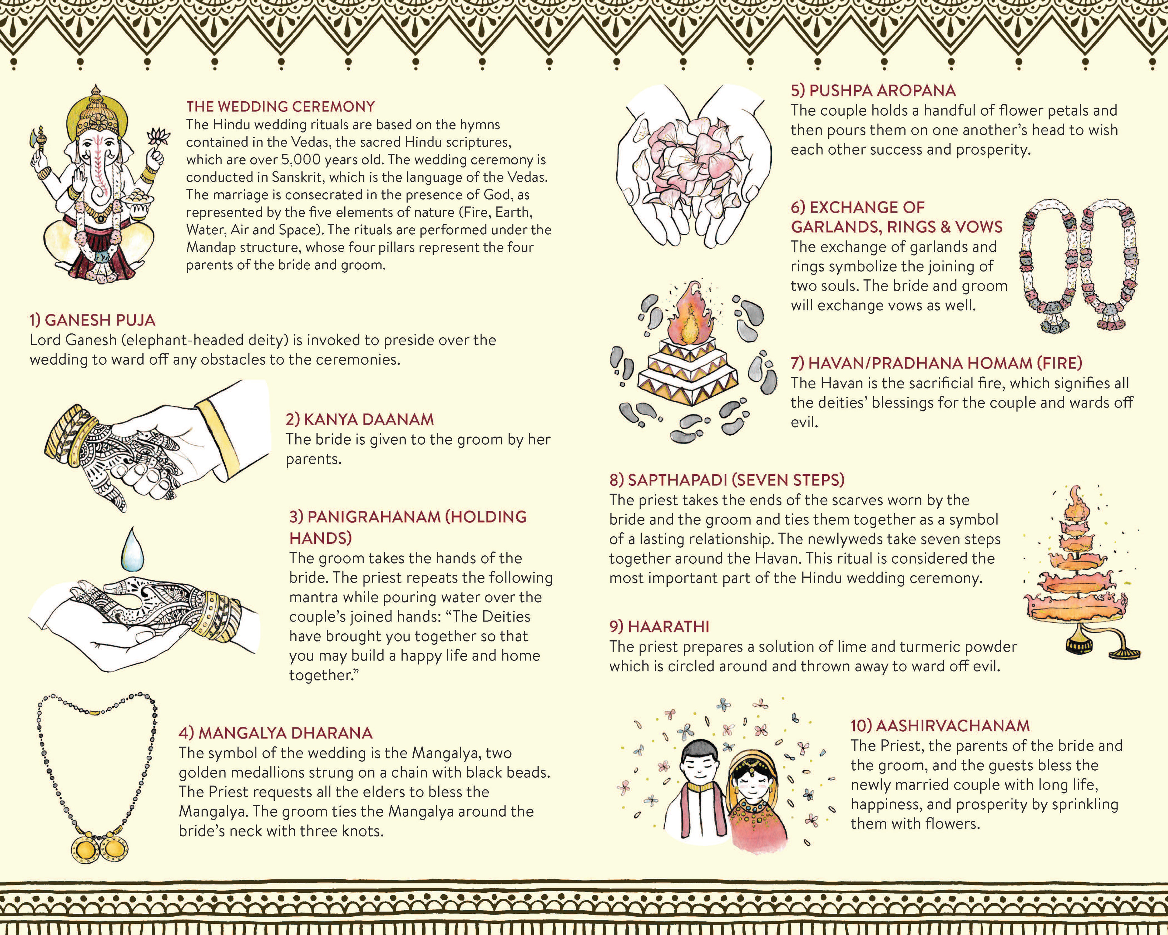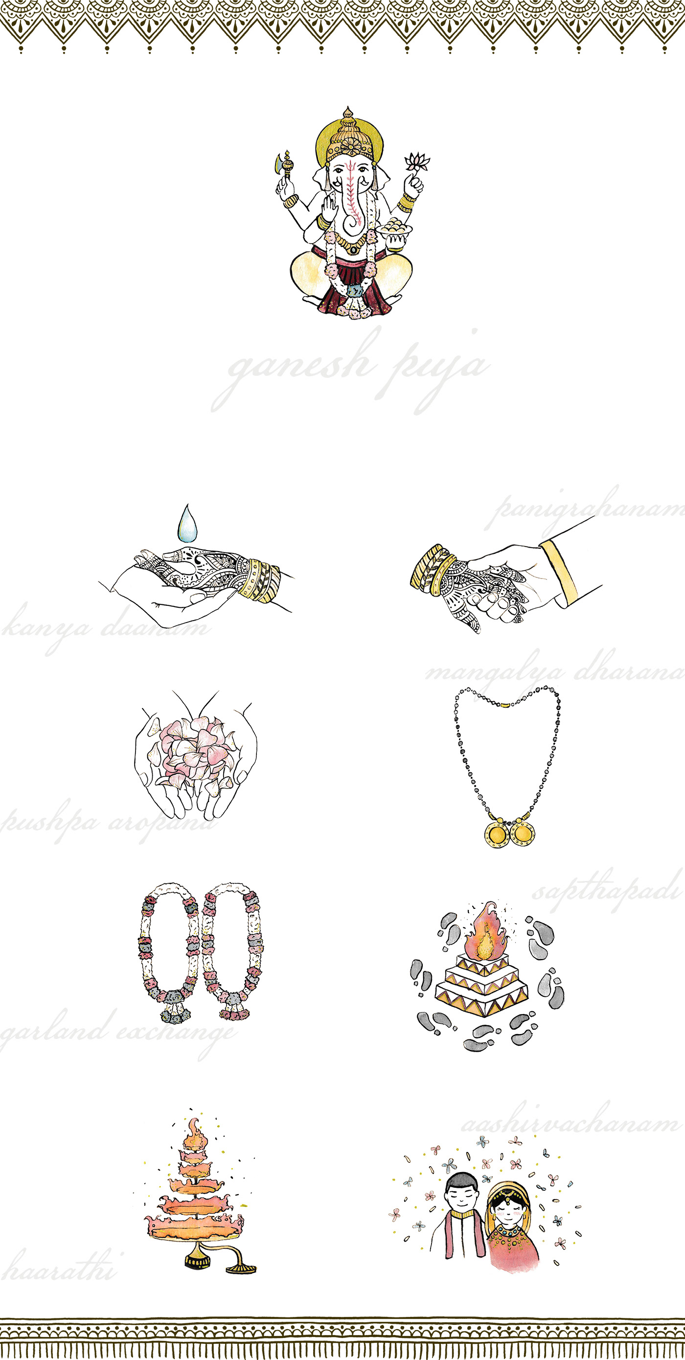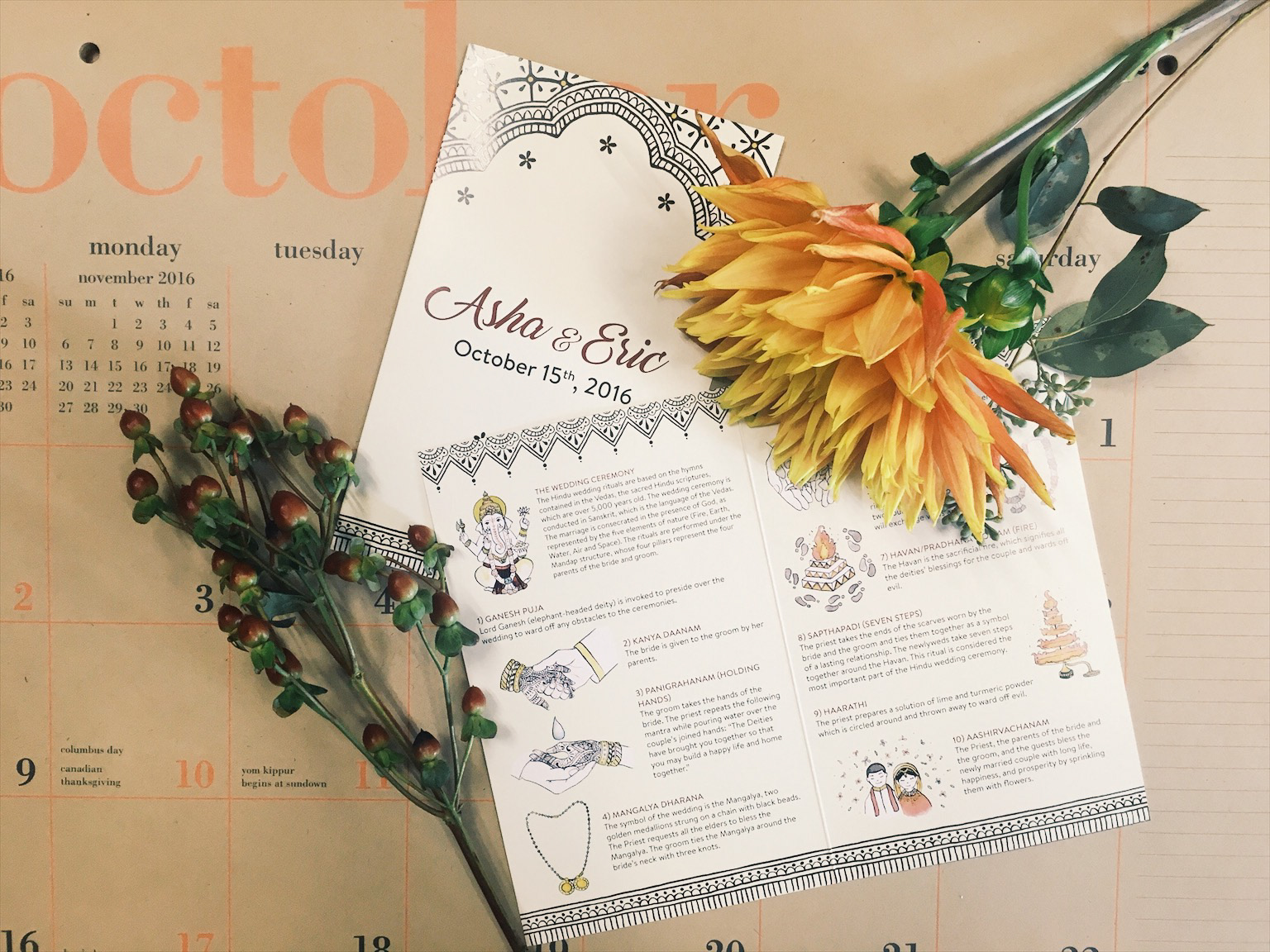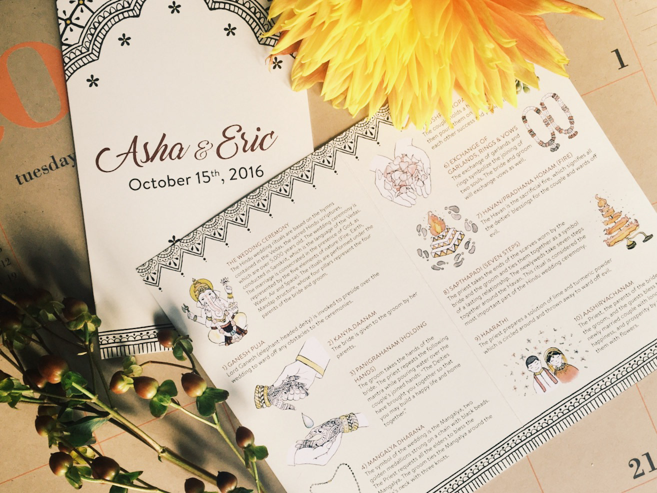 Indian wedding program with illustrated steps of the ceremony. The illustrations are made with India brown ink and watercolor.