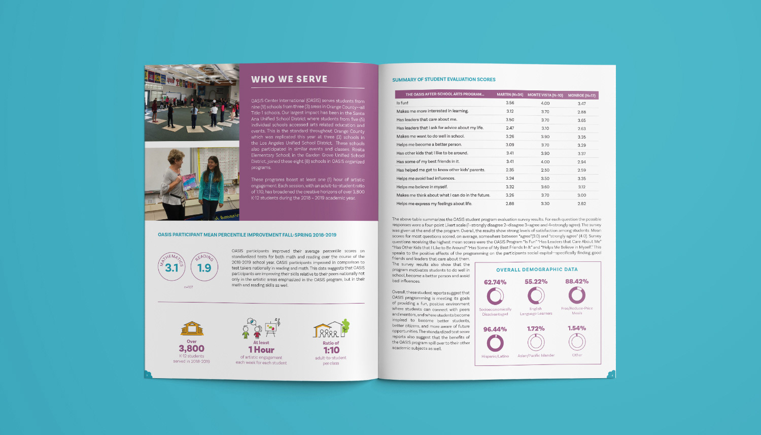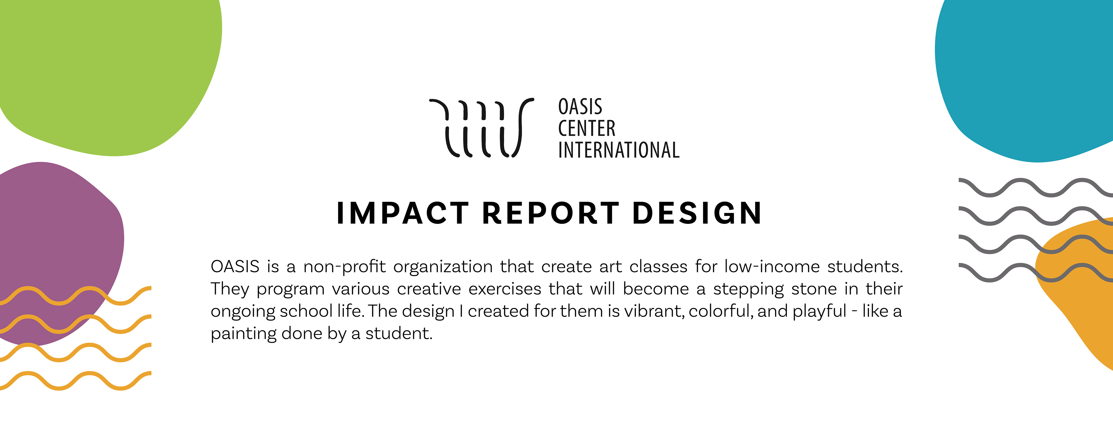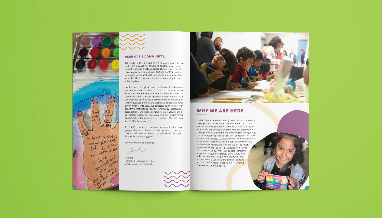 Impact report design for OASIS. Design inspired by playful and color children's illustration.
